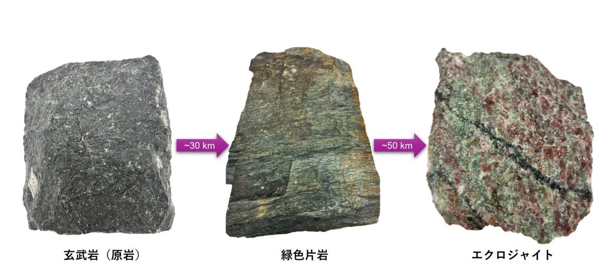 左から順に、玄武岩[長野県産]、緑色片岩[高知県産]、エクロジャイト[中国産]。海洋地殻を構成する玄武岩質な岩石は、プレート運動によって海溝から地球内部に沈み込む。約30kmよりも深部にもたらされると、緑色の鉱物(緑泥石、角閃石、緑簾石など)が成長し、層状(ミルフィーユ状)の構造を持つ緑色片岩が形成される。さらに深部(約50km以上)になると、緑色のオンファス輝石と赤色のざくろ石を含むエクロジャイトが形成される。