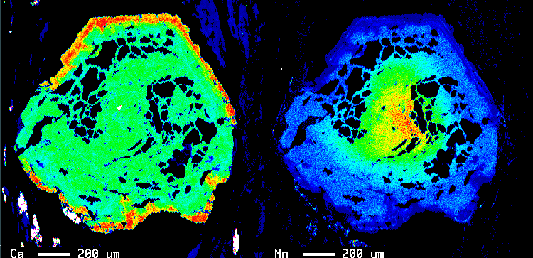 電子プローブマイクロアナライザー(EPMA)を用いて計測したざくろ石の組成の分布図。暖色系ほど元素の濃度が高いことを意味する。ざくろ石は結晶格子内に異なる原子が入ることができる固溶体を形成する。プレートの沈み込みによって地球深部に行くほど温度と圧力が上昇し、ざくろ石の結晶格子に入ることのできる安定な原子の種類が変化する。ざくろ石の固溶体組成を用いて熱力学計算を行うことによって、ざくろ石が成長するときに経験した温度・圧力状態を推定することができる。