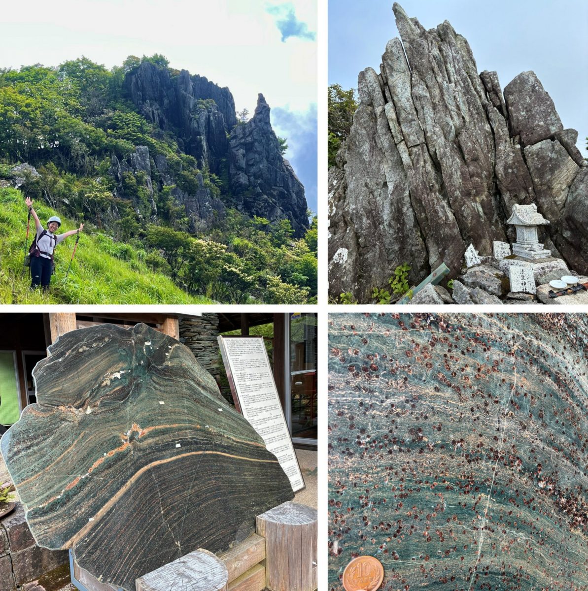 (左上)山頂付近に露出する石英エクロジャイト。ここの岩石を採取するために、山道を歩いて3時間ほど登る必要がある。(右上)石英エクロジャイトの露頭。小さな祠が祀られている。(左下)ふもとの町に展示されているエクロジャイトの石碑。2001年にこの地域で行われた第6回国際エクロジャイト会議を記念してつくられたもの。(右下)石碑の近接写真。赤い粒はざくろ石、薄い緑色の部分にはオンファス輝石が含まれる。濃い緑色の部分にはオンファス輝石が変質した角閃石という鉱物が含まれる。