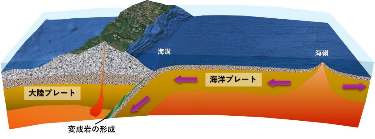 海洋プレートは大陸プレートよりも密度が大きいため、境界である海溝から地球深部へと沈み込む。海洋プレートの沈み込みに伴って地球深部に持ち込まれた岩石は高温・高圧・高応力環境下にさらされ「変成岩」が形成される。