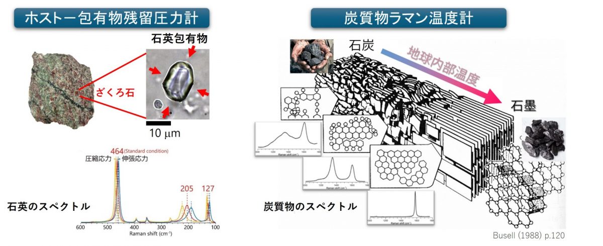 (左)ホス‐包有物残留圧力計。ざくろ石中に含まれる0.01 mm程度の微小な石英包有物にかかっている応力を、スペクトルのピーク位置のシフトから評価し、ざくろ石中に石英が取り込まれたときの圧力条件を推定する手法。(右)炭質物ラマン温度計。岩石に含まれる炭素を含む炭質物をラマン分光分析し、得られたスペクトルの面積比や半値幅から結晶化度を評価することで温度に換算する手法。