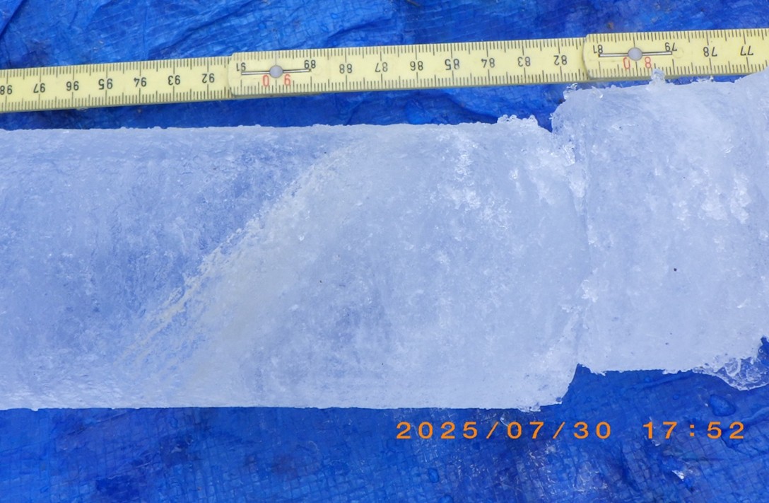 今回の調査を通して、私が最も印象に残ったのはアイスコアの掘削です。氷河内部は透視できないため、これまではレーダーを通して構造を観察したり、理論的に考えたりすることしかありませんでした。しかし今回、掘削したアイスコアの中に鉱物のラインが非常に美しく含まれているのを目にしたとき、理論上のイメージが現実の形として目の前に現れ、初めて内部を直接観察できたような深い感動を覚えました。