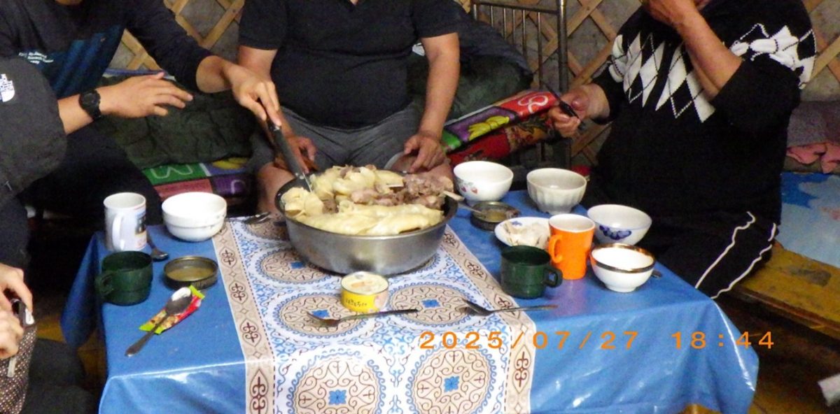 食事は写真のようにゲルで、現地の方手作りの伝統食を(沢山!)いただきました