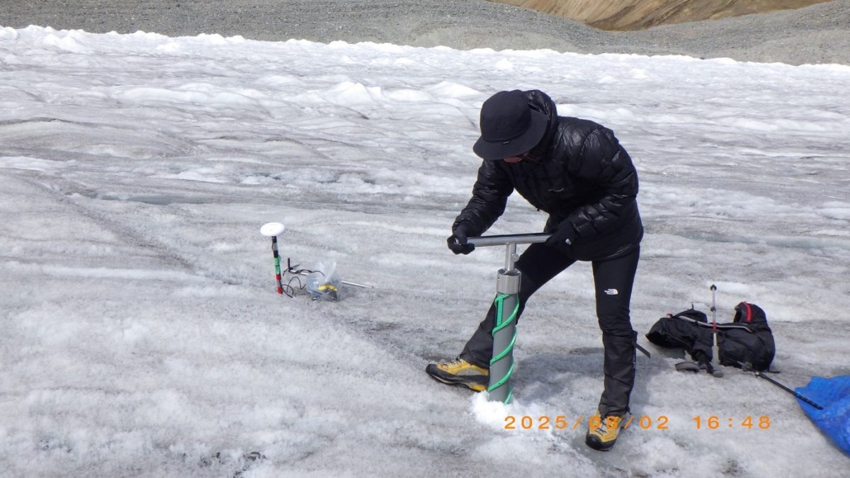 氷河での調査は主に、表面の氷のサンプリング(採取)、表層から約1mの深さまで掘削して行うアイスコア(氷の柱状試料)の採取、太陽光が氷河表面でどれだけ反射されているかを測定するアルベド(反射率)の観測、そしてタイムラプスカメラによる表面状態の記録などです。また、氷河近くからドローンを飛ばして表面の様子を撮影したり、昨年1年間の雨量や気温の記録データを回収したりもしました。