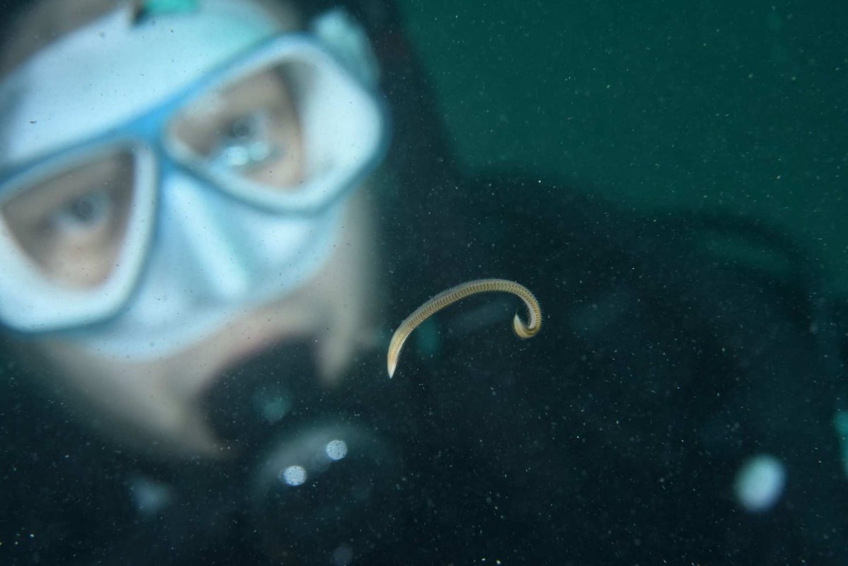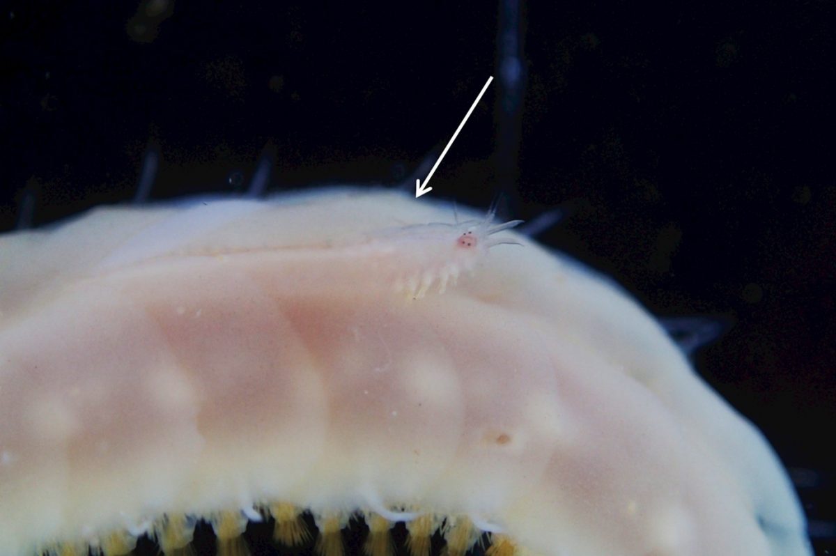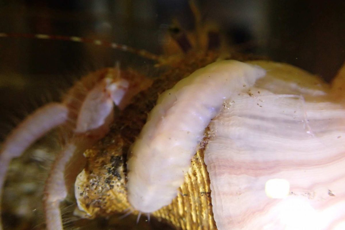 下の写真を見てみてください。これは、先生が発見された新種の一つであるウロコムシ科のゴカイ、「イッスンボウシウロコムシ」です。体にウロコのような構造を持つのが特徴です。ヤドカリの貝に居候して生活しており、写真では偶然表に出ているところが観察できます。