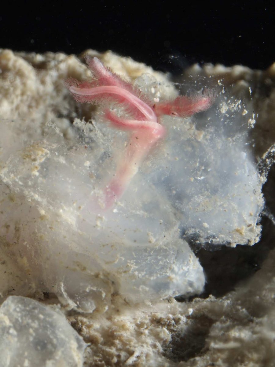 もう一つユニークなゴカイをご紹介しましょう。舞台は深海、海の底に沈んだ鯨の骨です。実はこの表面にも、骨の栄養を取りながら暮らすゴカイがいます。これは、「ホネクイハナムシ」です。口や肛門を持たず、体の一部から酸を分泌して骨を溶かし、その中に含まれる有機物を吸収して生活します。ライフサイクルはわずか二週間で、海底の鯨の骨においてのみ成長、繁殖する面白いゴカイです。